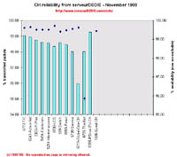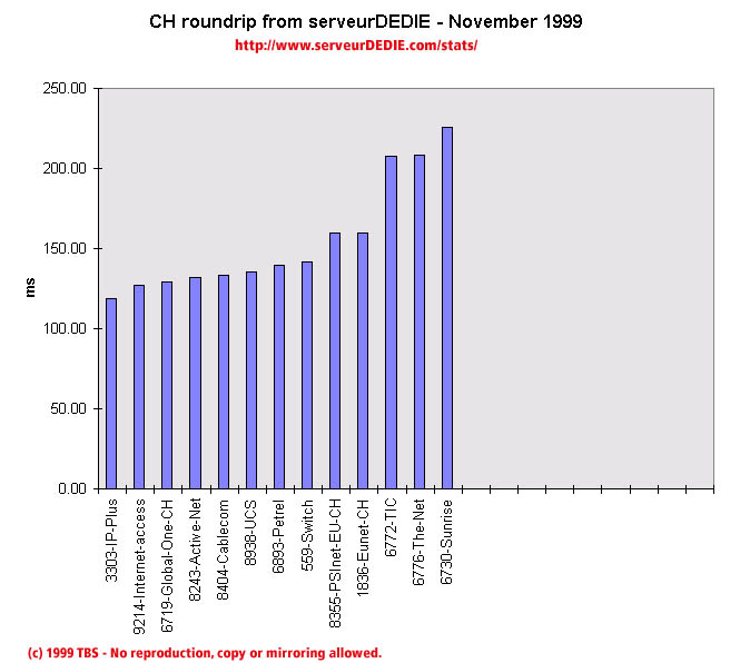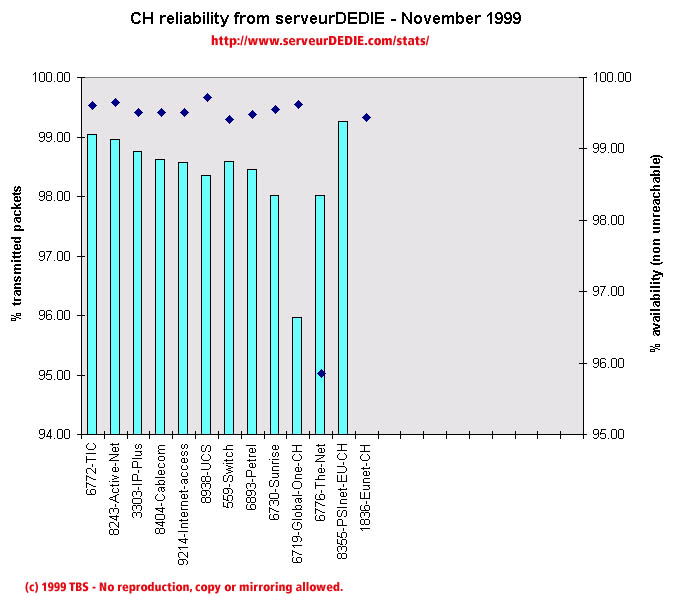 The November results are not as good as October ones. Main points this month: we measured Eunet-CH packet loss explode, with packet received well below 94%. Such bad results for Eunet were also measured in other European countries, so this is not a problem local to Switzerland. The-Net gets a lower packet loss but has increased unreachability.