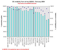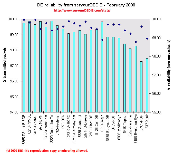 Our reliability graphic displays the percentage of packet loss on the left axis (cyan bars) i.e. 100 - packet loss %. On the right axis (blue points) we display the availability percentage i.e. 100 - unreachable % (unreachable result is attained when none of the 15 probe packets are returned). Therefore the longer the bars and the upper the points, the better.