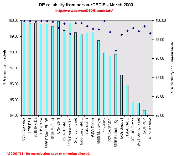 Our reliability graphic displays the percentage of packet loss on the left axis (cyan bars) i.e. 100 - packet loss %. On the right axis (blue points) we display the availability percentage i.e. 100 - unreachable % (unreachable result is attained when none of the 15 probe packets are returned). Therefore the longer the bars and the upper the points, the better.