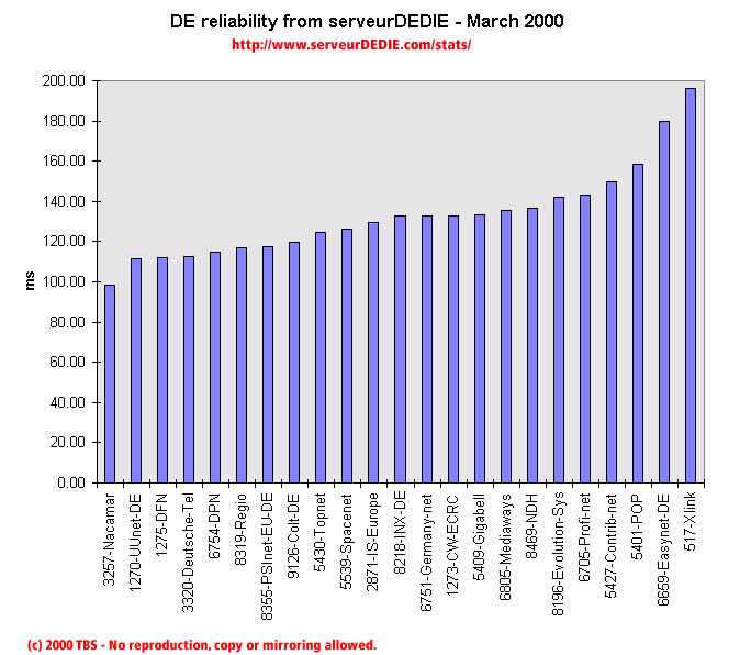 Our roundrip graphic displays the mean roundtrip time in milli-seconds. This graphic should not be read and analysed alone but with the availability chart above. Alone this chart does not mean much.
