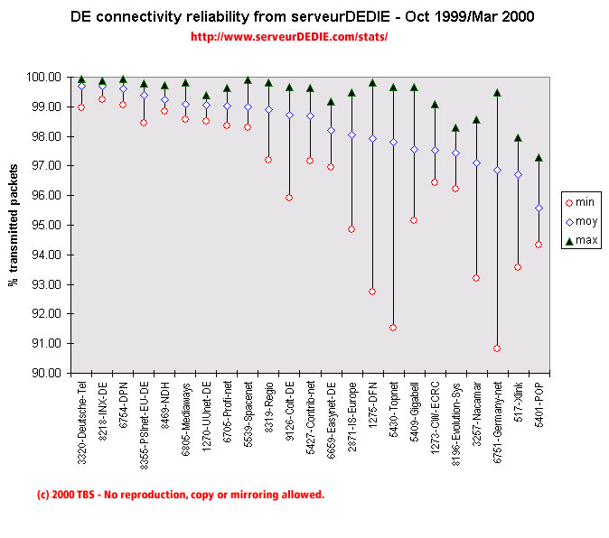 serveurDEDIE measures connectivity to DE operators from its multi-connected hosting center in Washington DC, USA. We publish monthly and yearly reports available online with a subscription. If you are not familiar with our reports, please check our methodology and interpretation notes. The TBS computation unit is a corrected transmitted packet rate which takes into account unavailability.
