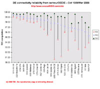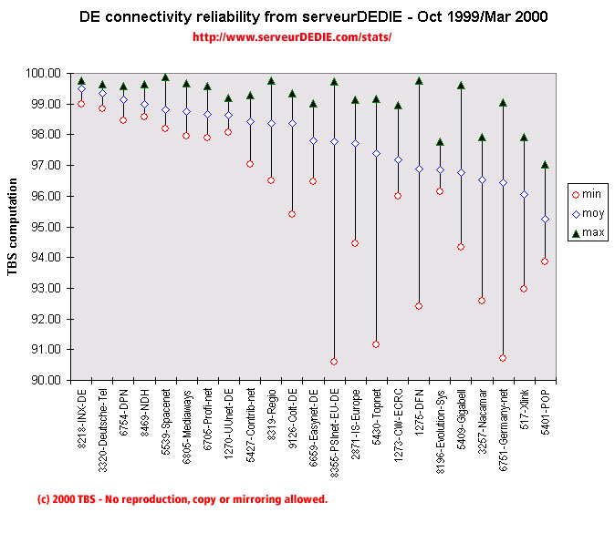 After those 3 performance leaders, our chart lists 12 good quality operators that score over 97 points average. Namely: Spacenet, Mediaways, Profi-net, UUnet-DE, Contrib-net, Regio, Colt-DE, Easynet-DE, PSInet-EU-DE, IS-Europe, Topnet, CW-ECRC