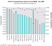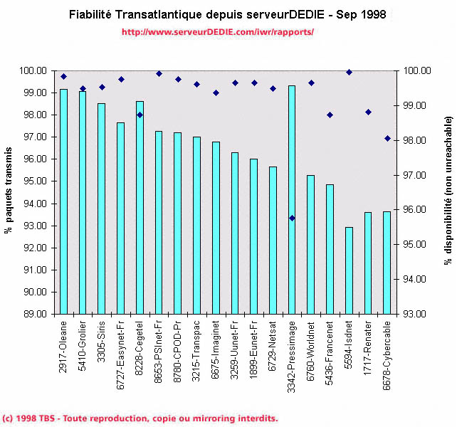 Heureusement il n'y a pas que des baisses; ainsi Oléane conserve sa position de leader et améliore même son taux de paquets reçus. Bravo! Cegetel a finalement réglé ses problèmes avec Teleglobe et gagne 8 places. Ceci n'est pas le résultat de l'affaiblissement des autres, c'est bien bien une augmentation de plus de 2 points des performances. Siris améliore aussi ses performances et gagne ainsi 5 places.