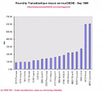 Renater obtient la palme de la dégringolade et se retrouve en avant dernière position, le calme des vacances est terminé. Chez Transpac pareil, moins 6 places. Du reste, les autres clients FT Opentransit sont aussi en baisse, Imaginet perd 6 places, Francenet aussi, et Pacwan aussi (Pacwan ne figure plus dans ces statistiques car ce prestataire n'est plus vraiment un opérateur puisqu'il n'achete son transit que chez Transpac). Seul Grolier, qui est aussi client Transpac, sort son épingle du jeu et renforce sa position. Les raisons de ces baissent s'expliquent par plus de traffic et par des pannes qui sont intervenues plusieurs fois sur Opentransit et un problème récurrent sur le noeud d'interconnexion Sprint de Washington.