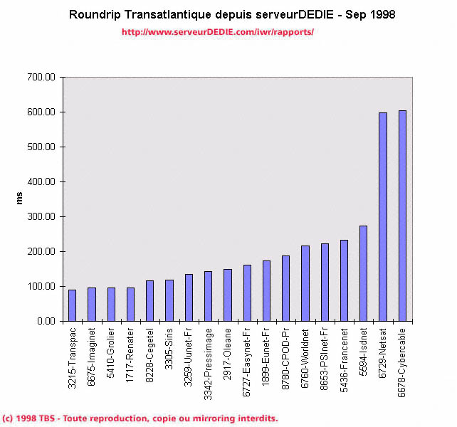 ISDNet nous a écrit pour commenter nos chiffres du mois dernier. L'opérateur nous indique que le DNS primaire que nous utilisons est dans leur ancien NOC qui est relié au nouveau par des liens internes qui "ont pu etre saturés". Ceci devrait être réglé par le prochain déménagement. L'opérateur ajoute qu'il est entrain de déployer 2 nouveaux liens transatlantiques: New-York - Sophia Antipolis et un Washington - Paris qui fournira du transit sur Above Net (AS6461), UUnet (AS701) et une présence au MAE-E. En attendant, le mois de septembre d'ISDNet ressemble au précédent.