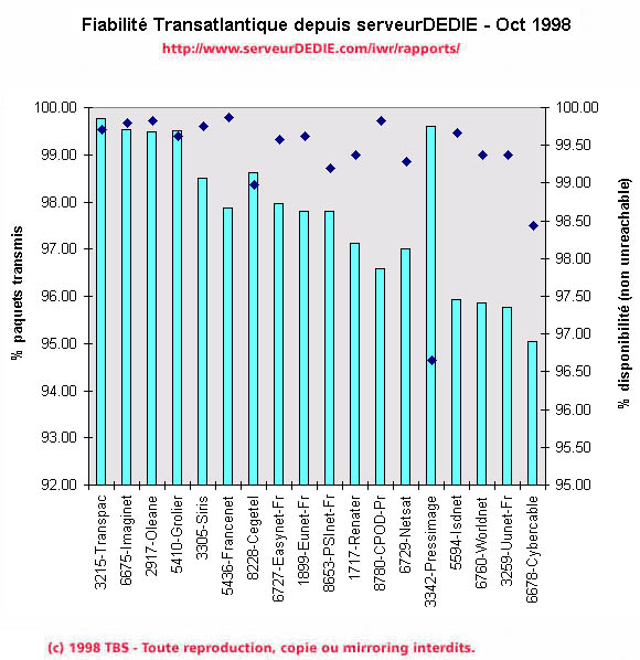 Octobre a été un très bon mois, le meilleur depuis juillet avec une moyenne de 97.65% de paquets reçus! La quasi totalité des opérateurs améliorent leurs performances à l'exception notable de UUnet France.