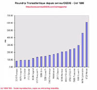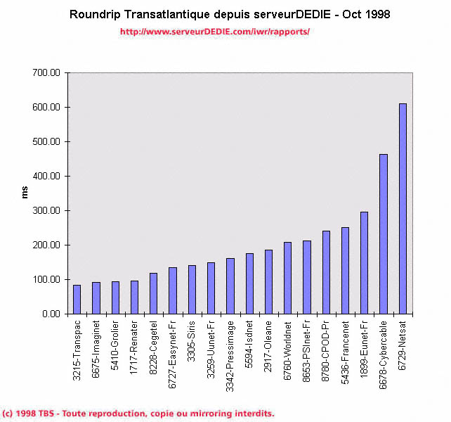 Isdnet nous a recemment expliqué que les roundtrip des clients Opentransit ne sont pas significatifs de la bande passante réellement allouée car en mode clear-channel. La connectivité est partagée sur de très gros tuyaux, ce qui rend les valeurs plus faibles qui si chaque client avait un circuit transatlantique dédié. Raison de plus pour ne pas mélanger roundtrip et débit.