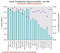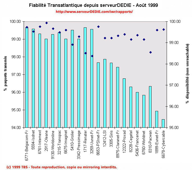 MCI-Worldcom n'est pas à la fête en août. Tous ses clients reculent. Le premier d'entre eux, UUnet France, connait des jours difficiles, avec beaucoup d'indisponibilité. Ses clients LSI et Francenet en font les frais. Claranet France qui se connecte chez UUnet US est également en forte baisse, car les problèmes MCI-Worldcom n'ont pas épargné la côte Est des Etats Unis. De plus MCI-Worldcom a du faire face à un écroulement d'une partie de son réseau Frame Relay aux US qui a duré une dizaine de jours avec des conséquences catastrophiques pour ses clients. Ceci rappelle la catastrophe AT&T survenue l'année passée et nous met tous en garde du danger de mettre tous nos oeufs dans le même panier (ou devrait-on dire mettre tous nos cables dans le même fourreau).