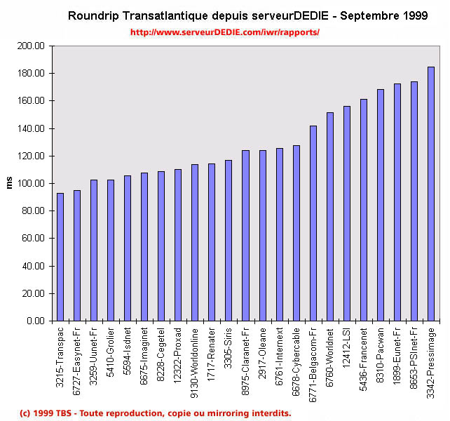 En bonne forme on retrouve ce mois-ci Imaginet, Grolier et Renater et dans une moindre mesure Transpac qui est un peu moins stable que d'habitude. Bonne prestation pour Pressimage qui apparait pour la dernière fois dans ce classement; l'opérateur racheté par PSInet fusionne avec PSInet Europe. PSInet est entrain de supprimer tous ses AS Européens nationaux pour ne conserver qu'un AS, le nr 8355.