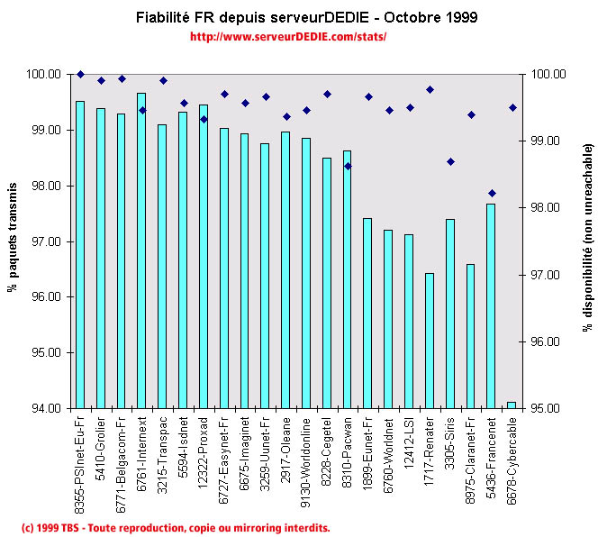 En forme comme le mois dernier on trouve: Grolier, Imaginet (bien qu'en legère baisse) et Transpac (qui regagne en stabilité). Isdnet et Belgacom France qui avaient chutés en septembre reviennent à leur niveau d'août. Isdnet est de plus présent au MAE-East coté ATM depuis peu et a mis en place un peering direct avec digitalNATION. Oleane fait de même depuis plusieurs mois.