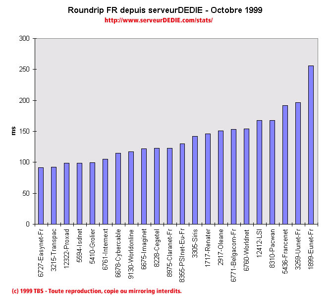 La palme française du mois revient à PSInet Europe, AS8355, qui a remplacé dans nos statistiques PSInet France (pour cause de restructuration). PSInet est l'un des dernier gros opérateurs internet qui n'appartient pas à un opérateur internet. Nos résultats vers d'autres pays d'Europe où PSInet est implanté sont bons également. Un opérateur à suivre...