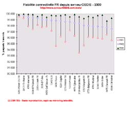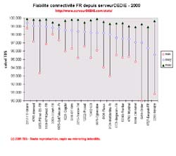 Ainsi là où en 1999 10 opérateurs dépassaient les 98% de paquets transmis, 15 les dépassent en 2000! L'année dernière, nous ajoutions que pour 19 opérateurs nous mesurions plus de 96% de paquets transmis, cette année, tous les opérateurs dépassent les 97%! De plus cette année, 5 opérateurs dépassent les 99% !!! La diminution des pertes de paquets induit une meilleure fluidité et rapidité des services internet et l'on peut espérer avoir du 99.9% de paquets transmis sur l'année 2001!