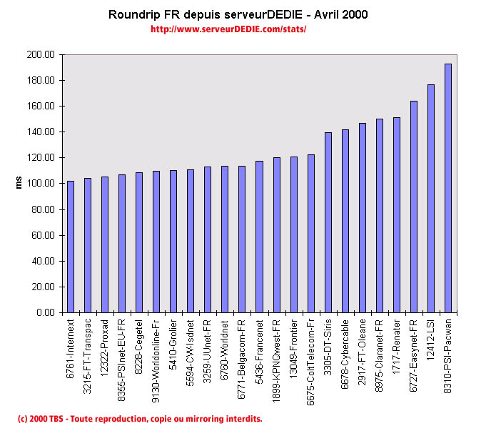 Parmis les autres excellents scores notons PSInet, Oléane, Belgacom (qui fait une nette remontée) et Proxad sans oublier un nouveau venu dans notre tableau: Frontier, AS13049, qui fait son entrée directement dans le top-5. Frontier achète sa connectivité à Isdnet et Internext.