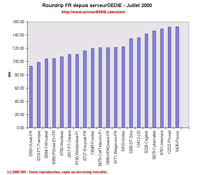 A noter également: la disparition de Claranet France de nos mesures. Suite aux problèmes de non-testabilité du mois dernier, la situation est restée inchangée en Juillet et nous avons décidé de ne plus les mesurer. Pour Renater, la situation actuelle du routage fait que nous ne pouvons plus faire de mesures fiables. De ce fait la mesure de Renater est interrompue.
