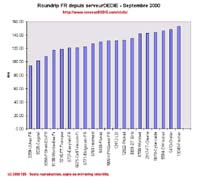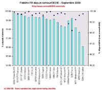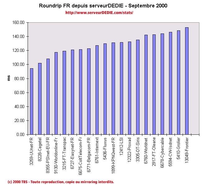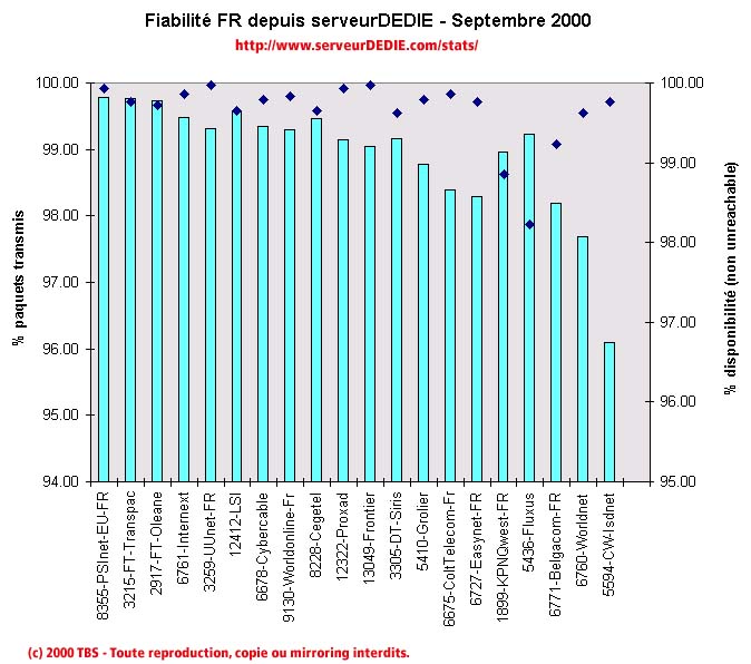 On notera les baisses de KPNQwest et de Fluxus qui ont connu des soucis d'indisponibilité. Isdnet n'est toujours pas à la fête comme le mois dernier, l'opérateur du groupe CW a connu des problèmes de routeurs et nous mesurons des pertes de paquet importantes.