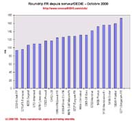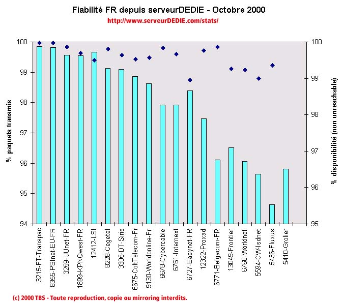 La palme du mois est décernée à France Telecom pour les performances de l'AS 3215 (anciennement Transpac)! L'opérateur "national" obtient une note TBS de 99.8 et devance d'un rien PSInet-Europe (la palme du mois de septembre). Excellent! A compter d'octobre nous ne mesurons plus l'AS 2917 (FT Oléane) du fait de sa fusion au sein du 3215.