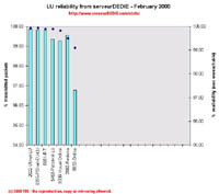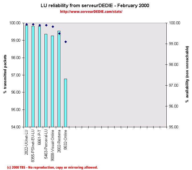 Our reliability graphic displays the percentage of packet loss on the left axis (cyan bars) i.e. 100 - packet loss %. On the right axis (blue points) we display the availability percentage i.e. 100 - unreachable % (unreachable result is attained when none of the 15 probe packets are returned). Therefore the longer the bars and the upper the points, the better.