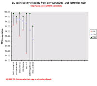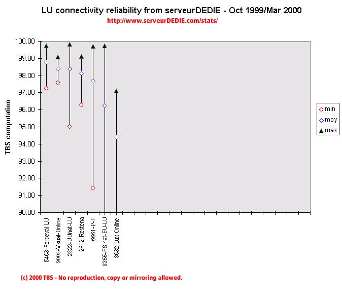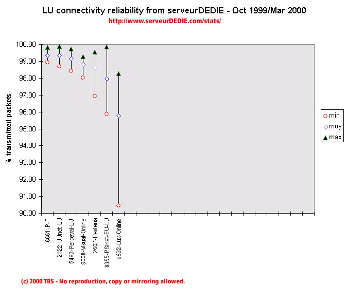 serveurDEDIE measures connectivity to LU operators from its multi-connected hosting center in Washington DC, USA. We publish monthly and yearly reports available online with a subscription. If you are not familiar with our reports, please check our methodology and interpretation notes. The TBS computation unit is a corrected transmitted packet rate which takes into account unavailability.