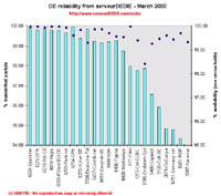 Our reliability graphic displays the percentage of packet loss on the left axis (cyan bars) i.e. 100 - packet loss %. On the right axis (blue points) we display the availability percentage i.e. 100 - unreachable % (unreachable result is attained when none of the 15 probe packets are returned). Therefore the longer the bars and the upper the points, the better.
