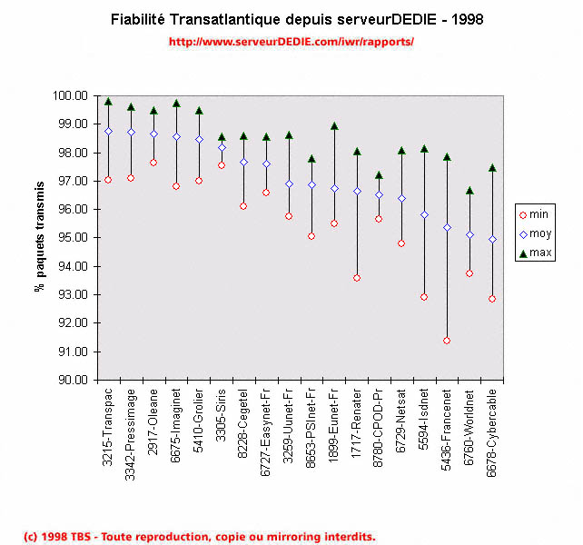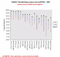 Notre graphique de fiabilité permet de visualiser pour chaque opérateur la moyenne de son pourcentage de paquets transmis (losange bleu) ainsi que la plus faible (cercle rouge) et la plus forte (triangle vert) de ses performances. Le graphique est trié par moyenne. A la lecture de ce graphique et des autres il y a différentes raisons de ce réjouir. La première n'est pas directement visible sur le graphique: la qualité des liens transatlantique des opérateurs a progressé! On compte maintenant 6 opérateurs dont la moyenne dépasse 98% de paquets transmis dont 5 d'entre eux ont au moins sur un mois dépassé les 99%, ce qui forme l'élite de ce tableau (Transpac, Pressimage, Oléane, Imaginet et Grolier). On peut ajouter que 12 opérateurs ont maintenus un niveau de performance supérieur à 95%, ils forment un second groupe de qualité confirmée (Siris, Cegetel, Easynet France, UUnet France, PSInet France, EUnet France et CPOD Provider). De quoi être rassuré sur la qualité de l'internet disponible en France, sur la capacité des opérateurs à progresser, et surtout enterrer cet adage qui voudrait que plus ca va, plus internet est encombré!