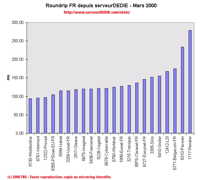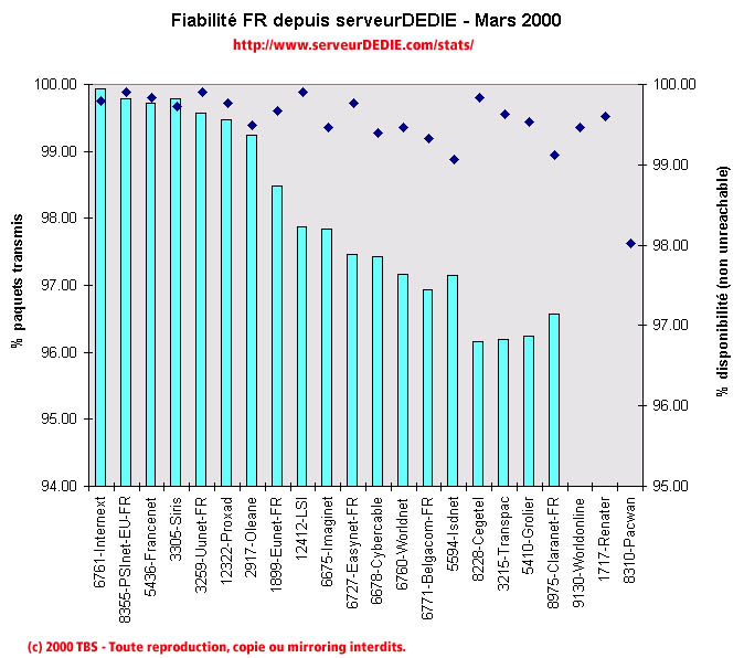 Certes il y a toujours des valeurs qui ont maintenu en Mars un bon niveau de performance: Oleane, Proxad, UUnet-France, Siris, Francenet, PSInet-EU et Internext. Ce dernier obtient la palme du mois! Internext réalise depuis plusieurs mois d'excellentes performances et voit ses efforts récompensés par une palme. De plus, on notera qu'Internext obtient le score de 99.93596 pourcent de paquets transmis! Ca y est, cette fois on peut commencer à parler de 99.9 % de quelque chose en matière d'internet!