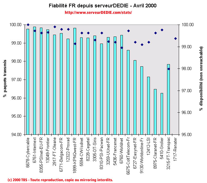 Autres bons scores: KPNQwest (ex EUnet) qui confirme son retour aux bonnes performances, Isdnet, Cegetel et Siris. Tous ces opérateurs ont réalisé plus de 99% de paquets transmis sur le mois, hors indisponibilité.