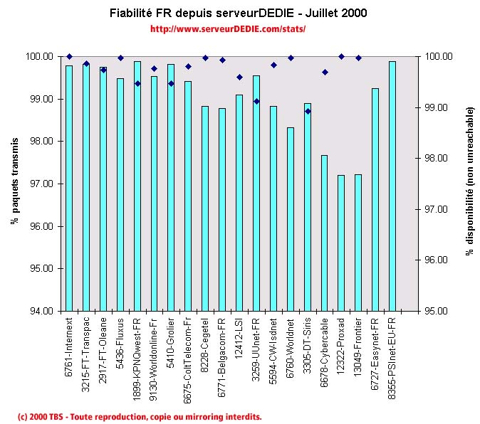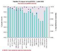 Coté baisses on notera Cybercable (notre palme du mois de Juin), Proxad et Frontier qui tout 3 ont eu des problèmes avec leur taux de perte de paquets. Les deux autres baisses sont dus à des problèmes de disponibilité: Easynet-FR et PSInet-EU-FR.
