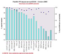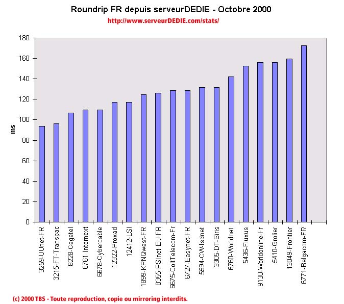 La palme du mois est décernée à France Telecom pour les performances de l'AS 3215 (anciennement Transpac)! L'opérateur "national" obtient une note TBS de 99.8 et devance d'un rien PSInet-Europe (la palme du mois de septembre). Excellent! A compter d'octobre nous ne mesurons plus l'AS 2917 (FT Oléane) du fait de sa fusion au sein du 3215.
